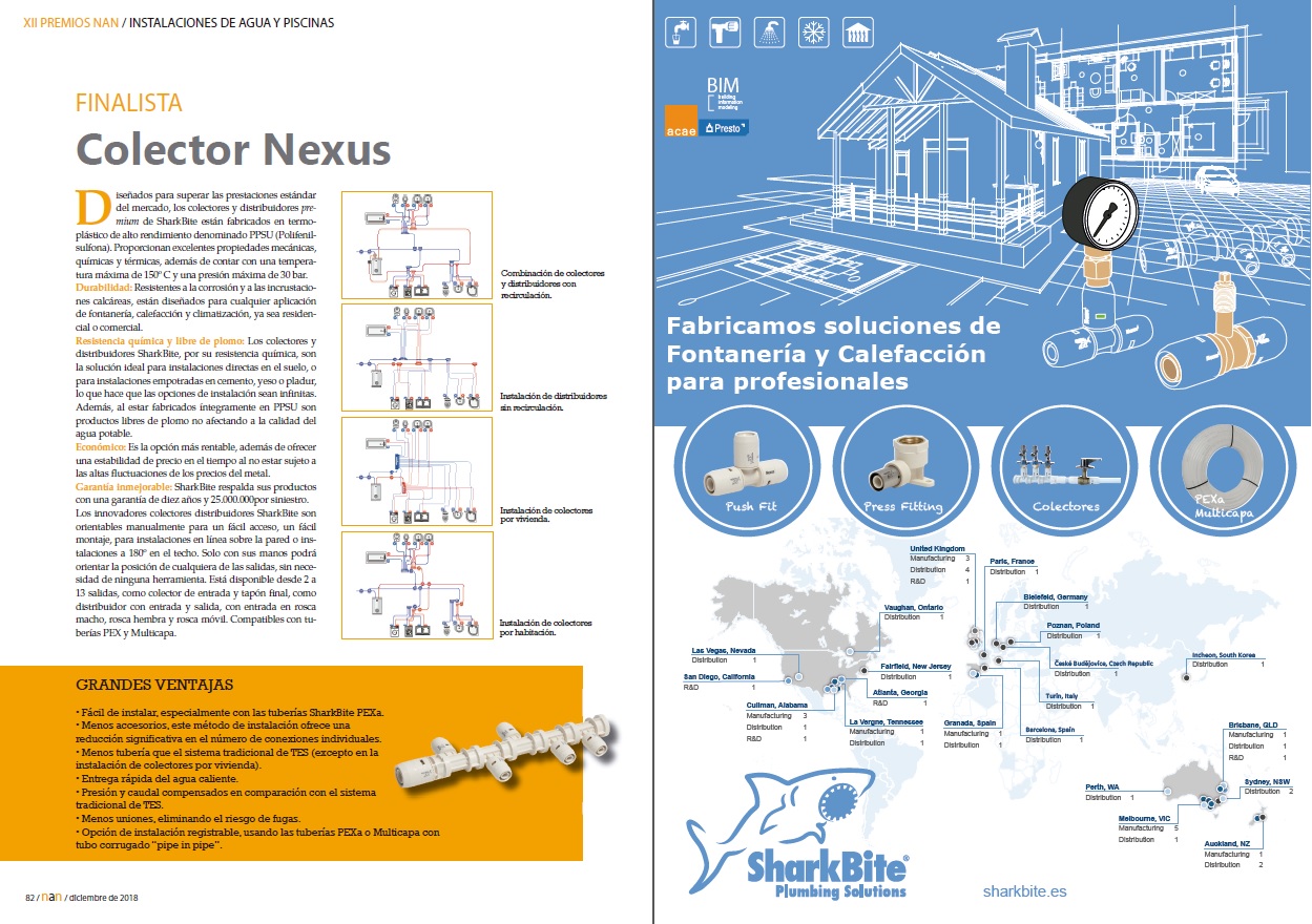 El pasado 15 de Noviembre se celebró en la Estación gran teatro Bankia de Madrid la XII edición de los Premios NAN de Arquitectura y Construcción, donde nuestro Colector Orientable SharkBite NEXUS quedó finalista en el apartado de mejor innovación en Instalaciones de Agua y Piscinas.